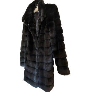 The coat is soft and fluffy, fully lined, with two side lined pockets and multiple covered snap closures. Has a very luxurious, chic look and feel!