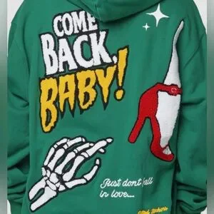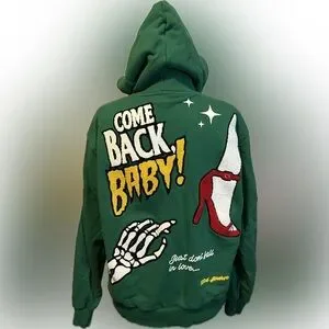 City Puff hoodie inspired by old Hollywood movie posters. Unique enlarged chenille patchwork, puff printed graphics and chain stitch embroidery.