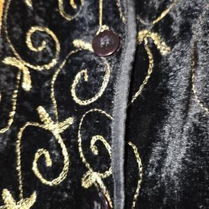 Pre-owned Vintage 90s Jacket Top from Marisol. Made of a soft Velour, very funky. Colors of Gold, Black and Burgundy. Long sleeves, buttons on front. Embroidered. I was very disappointed when I spotted the flaw on back, which I describe below. I didn't even notice it until I was measuring the shoulders.