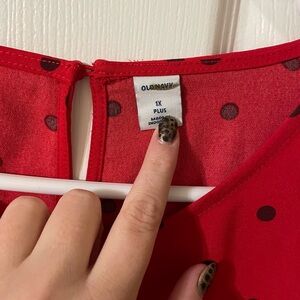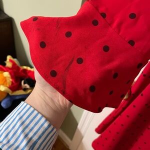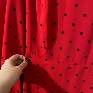 Chic long sleeve dress with playful polka dots. Vibrant red fabric with black accents. Perfect for any occasion.