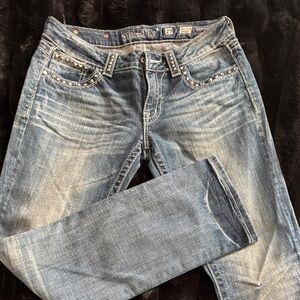 Chic boot cut jeans in medium blue. Features embellished back pockets. Ideal for casual wear. Jewel and metal detail. Like new.