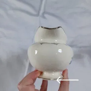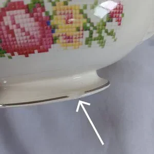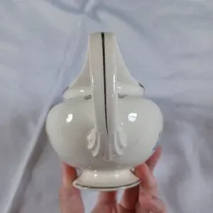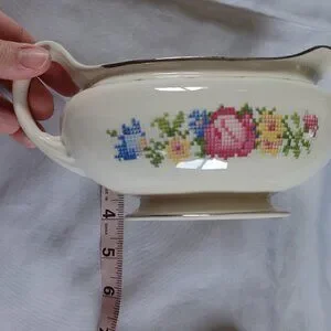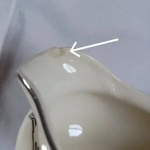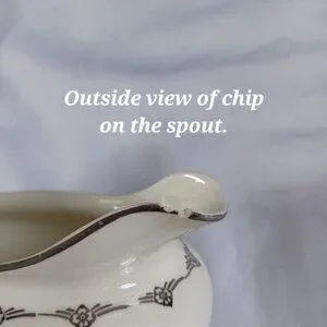 Vintage gravy boat made in the USA. Item is flawed. There are 3 chips. Two on the edge of the foot and one on the edge of the spout. See photos. No other flaws noted.