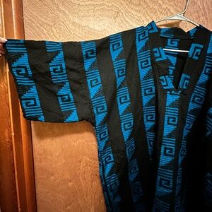 Stylish poncho with a striking black and blue geometric pattern. Perfect for adding a bold touch to any outfit. Has a pocket on the front.