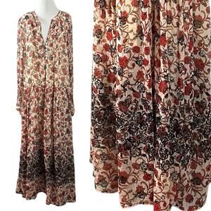This effortlessly chic maxi dress has a pleated bottom hem, a button-front collar, and a semi-sheer construction for added dimension. It is printed to perfection in an eternally feminine, flower motif.