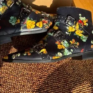 Step out in style with these chic floral buckle ankle boots. Perfect for adding a pop of color to any outfit. Black/yellow/green/coral inside zipper silver hardware