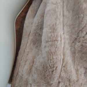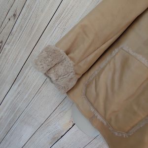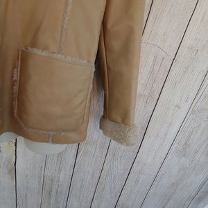 Camel colored, sherpa lined leather coat. Size small in excellent condition. Full button closure, two large front pockets. Very warm & great looking!