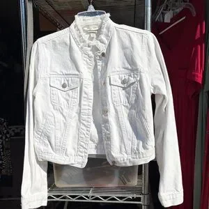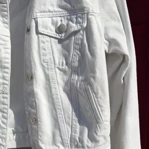 Elevate your style with this classic white denim jacket. Perfect for layering, this versatile piece adds a chic touch to any outfit. No stains