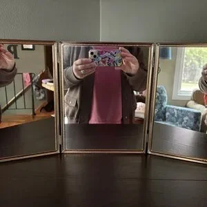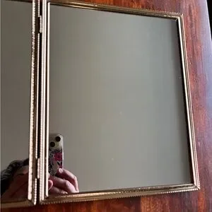 Elegant set of mid century mirrors, that exude vintage charm with its retro design and gold colored frames. Each mirror size is 8x10”. Can be hung on wall or displayed on a table top!