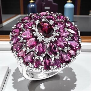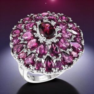 Signed D'Joy Tanzanian Wine Garnet 13.30 ctw m Flower Ring in Rhodium Over Sterling 925 Silver SIZE 7.