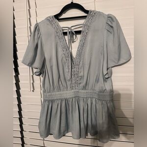 Light blue blouse with V-neck. Features flutter sleeves and smocked waist. Perfect for casual wear.