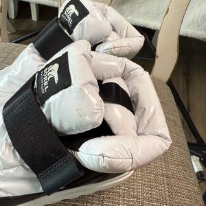 Stylish and functional Sorel Kinetic Short Snow Boots in women’s size 6.5 (USA). Colorway features a glossy white upper with black accents, a wide velcro strap across the top, and the signature bold SOREL tread on the sole. Designed to keep your feet warm and dry with waterproof materials and a modern sneaker-boot design.