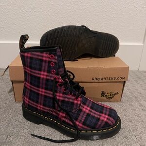 Classic Dr. Martens boots with a striking black and pink design. Ideal for making a statement.