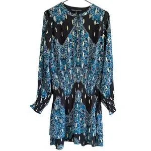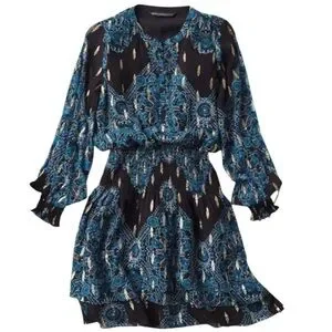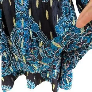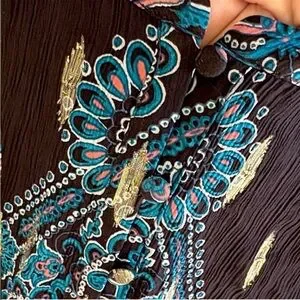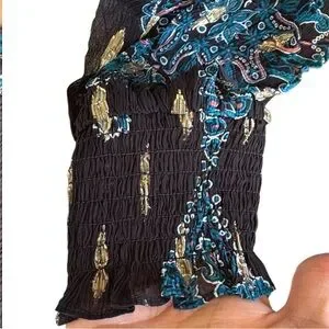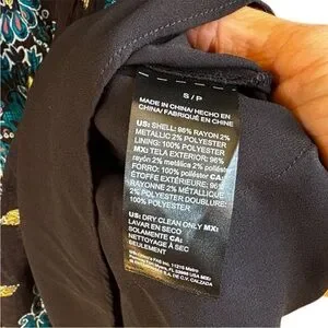 Excellent condition; Rayon/polyester/metallic fibers; smocked waistband and cuffs; double ruffle skirt; button-up bodice with mandarin collar; pit to pit measures approx. 20" across; shoulder to hem measures approx. 36"; popover style (no zipper); smoke free home.