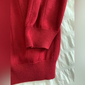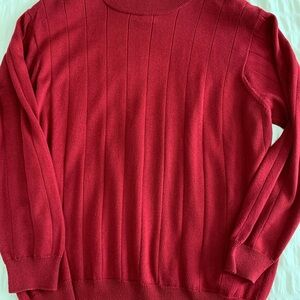 Chic and cozy turtleneck sweater. Vibrant red hue. Ideal for layering. This sweater has a mock neckline and thumb and a great classic pattern. It would look great under a vest or by itself. Size XL is 55% acrylic and 45% cotton.