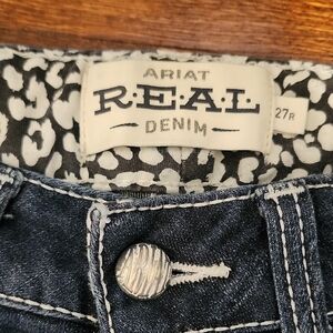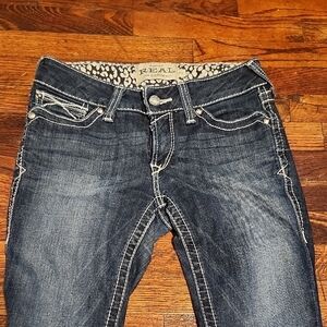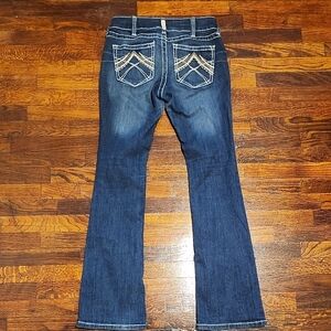 Coastal cowgirl style boot cut jeans by Ariat Real Denim. Dark blue with stylish stitching and embroidered back pockets. Low rise and perfect for casual wear.