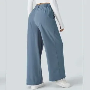 Halara Flex High Waisted Pocket Wide Leg Waffle Work Pant Pants Smokey Blue Gray Pull On Flat Front Elastic Back Waistband with Belt Loops Front Pleats Relaxed Fit Side Pockets High Waisted Wide Leg Stretch Office Career Casual Preppy