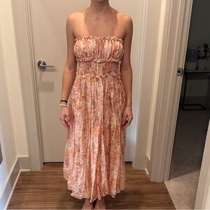 Elegant floral halter maxi dress with a flowing design. Features a mix of pink and orange hues.