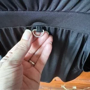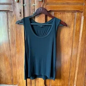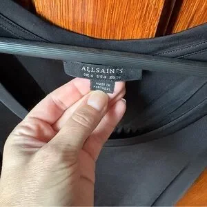 All Saints Sleek black tank top with a scoop neckline. Ideal for layering or wearing alone. Back has d-ring detail along with rouching. EUC.