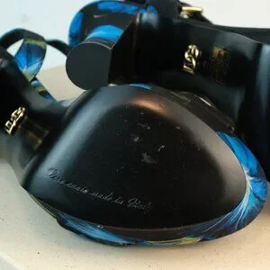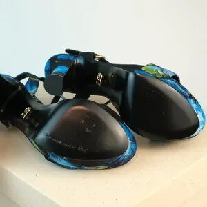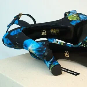 These D&G Floral Platform Sandals feature a rich black base adorned with a vivid blue floral pattern throughout the shoe. These platform heels are crafted from a luxurious stretch-silk charmeuse with a refined matte finish. The bold silhouette is defined by a thick platform, sturdy block heel, and a sleek ankle strap finished with a gold buckle. The perfect opportunity for an effortless statement of elegance and allure.