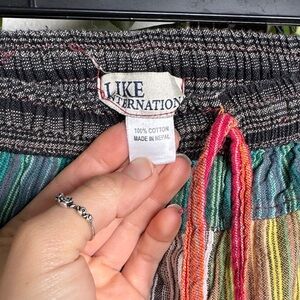 Stand out with these multicolor patchwork pants, perfect for casual wear. Enjoy comfort and style with every step. 100% cotton. Has a cinch at waist, but stretchy at waist. See measurements. No flaws. Brand: Like International. Has pockets.