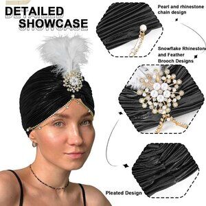 Features: This stunning turban is made of soft, breathable polyester with a glittering fabric that blocks wind — perfect for winter, spring, or fall. Embellished with a snowflake rhinestone brooch, feather, and a subtly hanging rhinestone pearl chain, it's both elegant and eye-catching. The ruffled, pre-tied design keeps your hairstyle in place without feeling tight or uncomfortable. Versatile and chic for daily wear, parties, weddings, or even as a chemo cap.