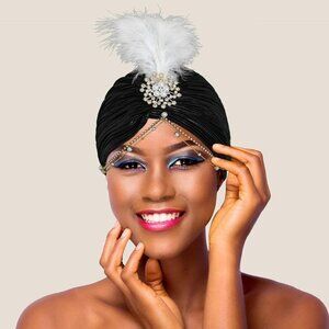 Women Rhinestone Turban Cap Pearl Feather Beanie — Vintage charm with a sparkle.