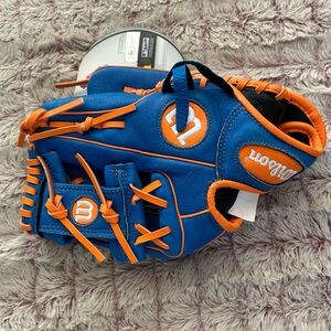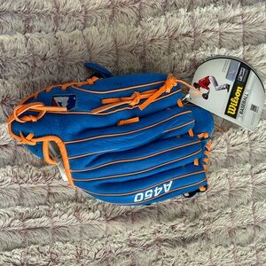 Dynamic Wilson glove in striking blue and orange. Ideal for baseball lovers.