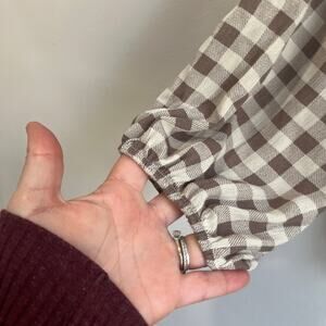 Torrid plus-size peasant babydoll top in neutral brown gingham. Features long sleeves, adjustable tie neckline, elastic waist, and flowy hem. Lightweight and perfect for layering or casual days out.