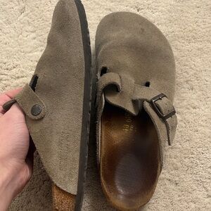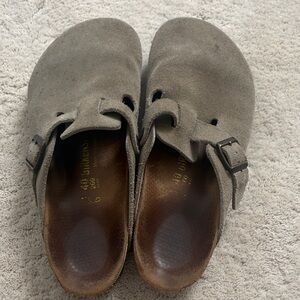 Comfortable Birkenstock suede clogs featuring a stylish buckle. Perfect for casual wear. Fair Condition