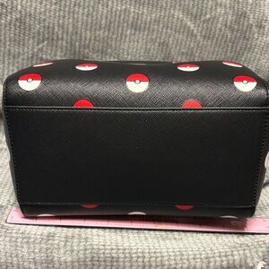 Chic Loungefly satchel with Pokémon ball pattern. Black base with red accents. Ideal for fans.