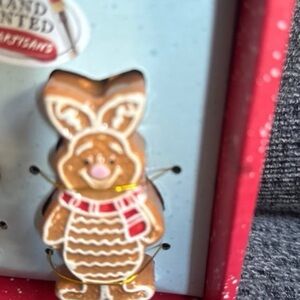 Charming hand painted gingerbread decor. Features festive red and white accents.