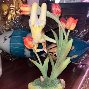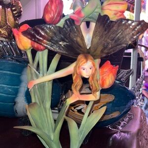 Delight in the whimsical charm of this fairy and tulip figurine. Featuring vibrant red and orange tulips, this piece adds a touch of magic to any space. Perfect for art lovers and collectors.