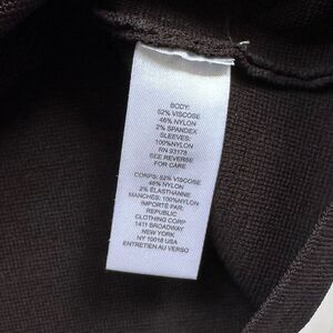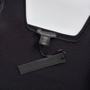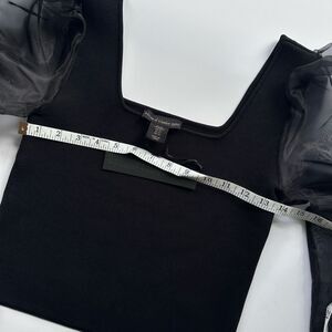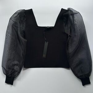 New with tags black stretch knit top with a squared off neckline, and long sheer puff sleeves, by House of Harlow 1960. Size XS.