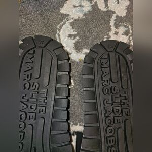 Stylish black slide sandals. Bold Marc Jacobs branding. Comfortable and chic.