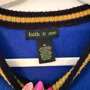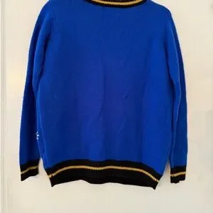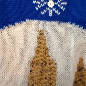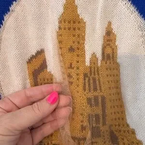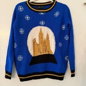 Stylish blue knit sweater with gold accents. Ideal for cozy days. Cityscape snowglobe detail with tulle detail over the circle. Sequins at the center of each snowflake. Worn once.
