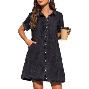 Women’s Denim Dress Cotton Blend Short Sleeve Pockets Babydoll Casual