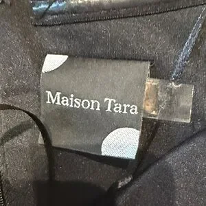 Elegant strapless dress by Maison Tara. Features a black textured pattern with a contrasting white panel. Perfect for formal occasions.