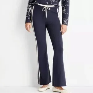 Elevate your style with these chic navy flare pants featuring a stylish white trim. Perfect for any occasion, these pants offer both comfort and elegance.