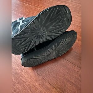 UGG warm and stylish boots for women. Black suede with gray spill seam detail. Some signs of wear, good condition.