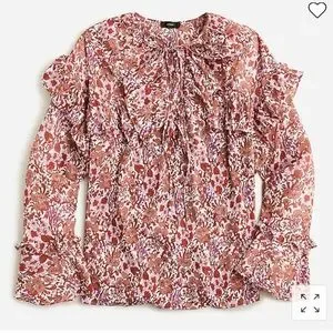J. Crew Ruffle Crinkle Chiffon Top. Size Large and NWT. Gorgeous ruffles adorn this blouse!! So feminine and fun! Body is lined. Ties at neck so you can adjust the look. 100% poly. Chest is approximately 23 inches and length is 24.