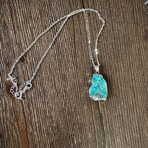 Elegant turquoise pendant necklace with a silver chain. Perfect for adding a pop of color to any outfit. Measures approximately 18 inches long with a 2 inch extender.