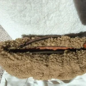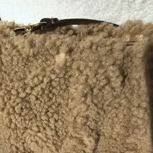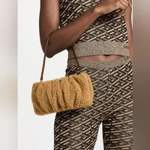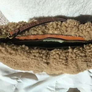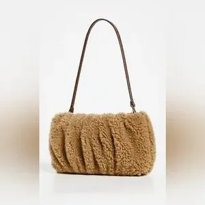 STAUD Bean shoulder bag with plush genuine shearling sheepskin outer. Green suede lining. Cognac leather removable strap.