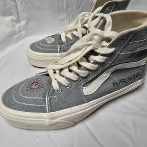Stylish Vans high-top sneakers. Gray canvas with white accents. Lace-up design.
