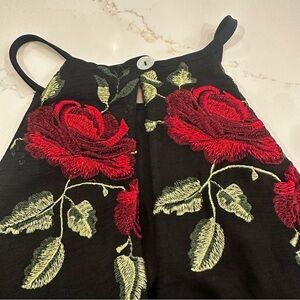 Chic black top with embroidered Rose design. Perfect for any occasion.