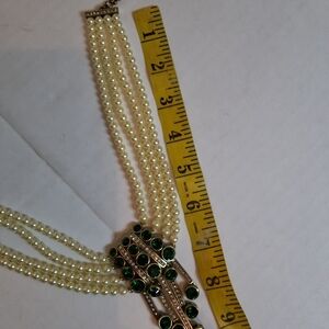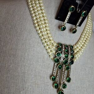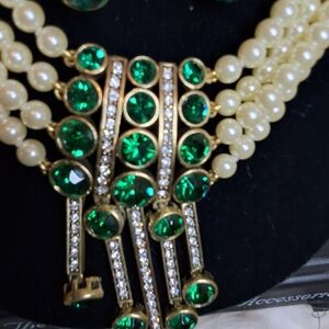 This stunning necklace set features elegant costume pearls and vibrant green gems, eing sold as a set.