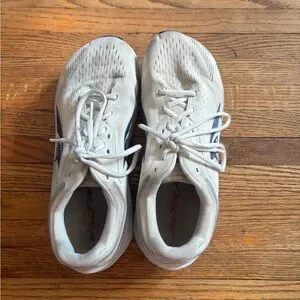 Stylish Altra athletic shoes. White upper with red accents. Comfortable and durable design.