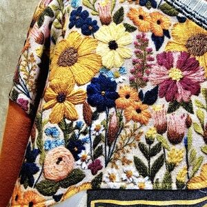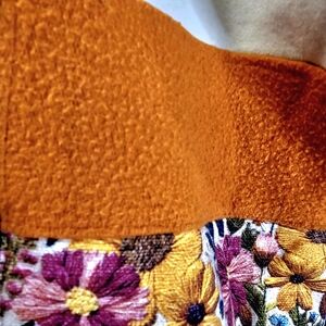 Made with a 3D print fabric made to look embroidered. Colorblocking with mixed textures such as fleece.