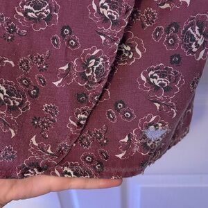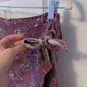 A charming vintage Abercrombie & Fitch asymmetrical skirt with a boho vibe. Features a maroon-purple floral pattern, tie waist, and button detail.