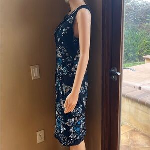 Beautiful White House Black Market midnight blue brocade midi length sleeveless sheath dress. Dark blue background with teal and silver embroidered floral design. Beautiful teal colored satin lining. Hidden back zipper. Back vent. In great used condition.