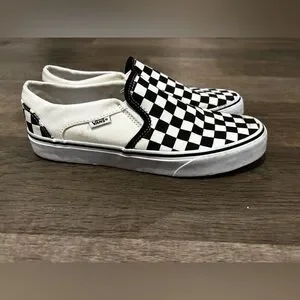 Checkered Vans slip-ons in black and white. Easy to wear and versatile. Scuff on top right shoe as pictured.